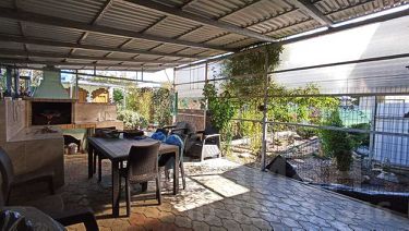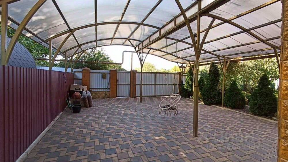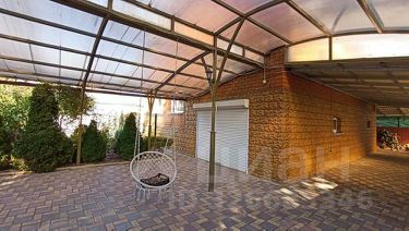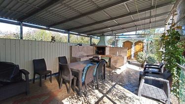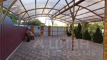Двор застелен плиткой, большой широкий навес, уличная душевая, зона отдыха и барбекю