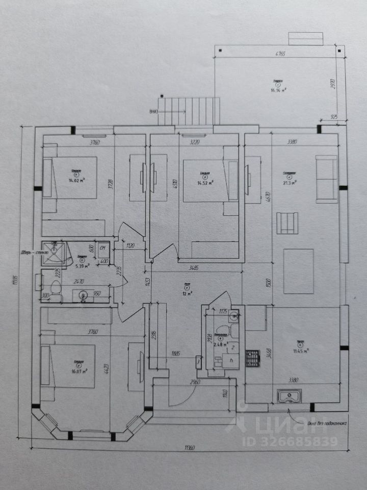 В доме большая кухня-гостиная 32,7 кв.м. с выходом на террасу 14,1 кв.м., три комнаты 16,1 кв.м., 14,0 кв.м. и 14,5 кв.м., просторный коридор, два санузла 5,4 кв.м. и 2,5 кв.м..