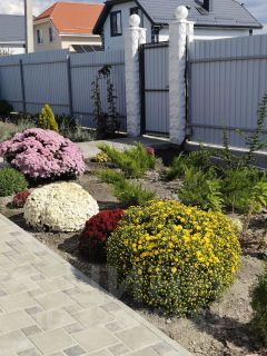 Удобное расположение дома на участке позволяет любоваться с террасы плодовым садом. Перед домом посажены многолетние цветы и декоративные растения.