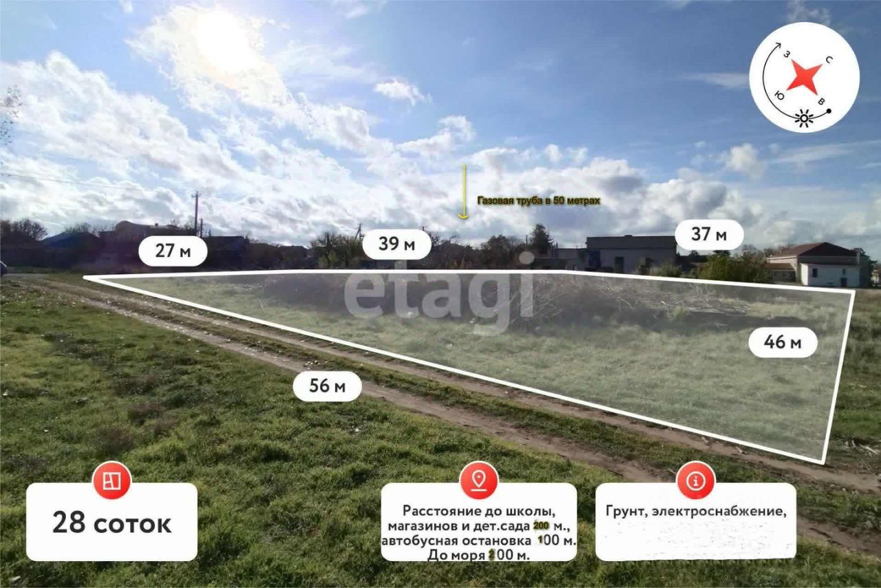 Ключевые коммуникации уже доступны: на участок выведен столб с электричеством, а газовая труба проходит по улице на расстоянии всего 50 метров. Уникальным преимуществом является вид на море, до которого примерно 200 метров по прямой. Местоположение исключительно удобно: в 100 метрах находится продуктовый магазин, в шаговой доступности — клуб с детскими площадками и стадион.