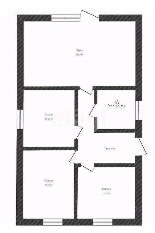 3 комнаты (11,5 м², 11 м², 13 м²), кухня-гостиная 28 м², санузел.