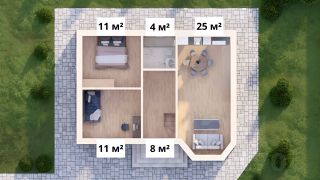 Планировочное решение :Две спальные комнаты ,большая кухня гостинная с выходом на задний двор ,ванная комната ,холл.Мансардный этаж свободной планировки.