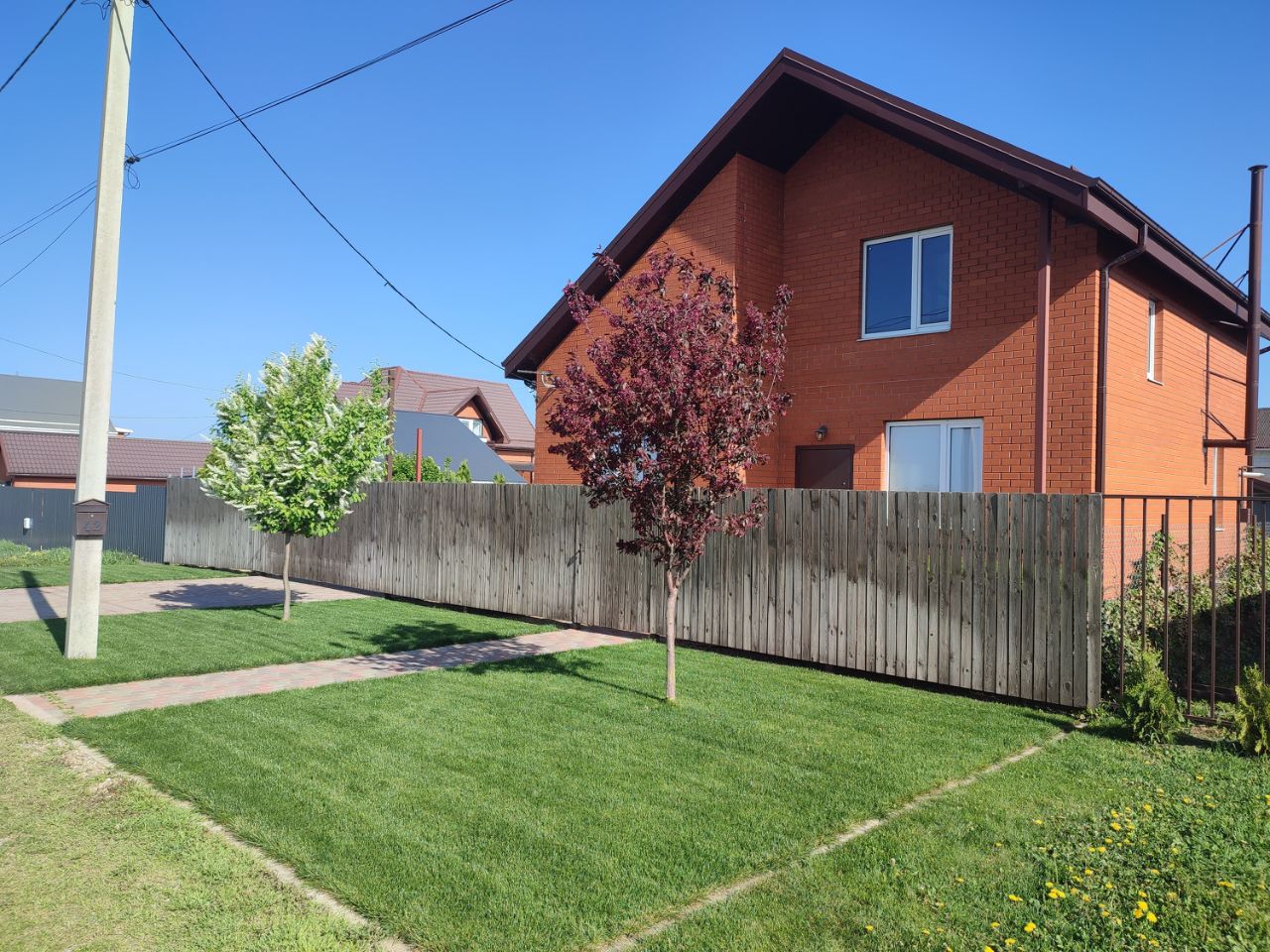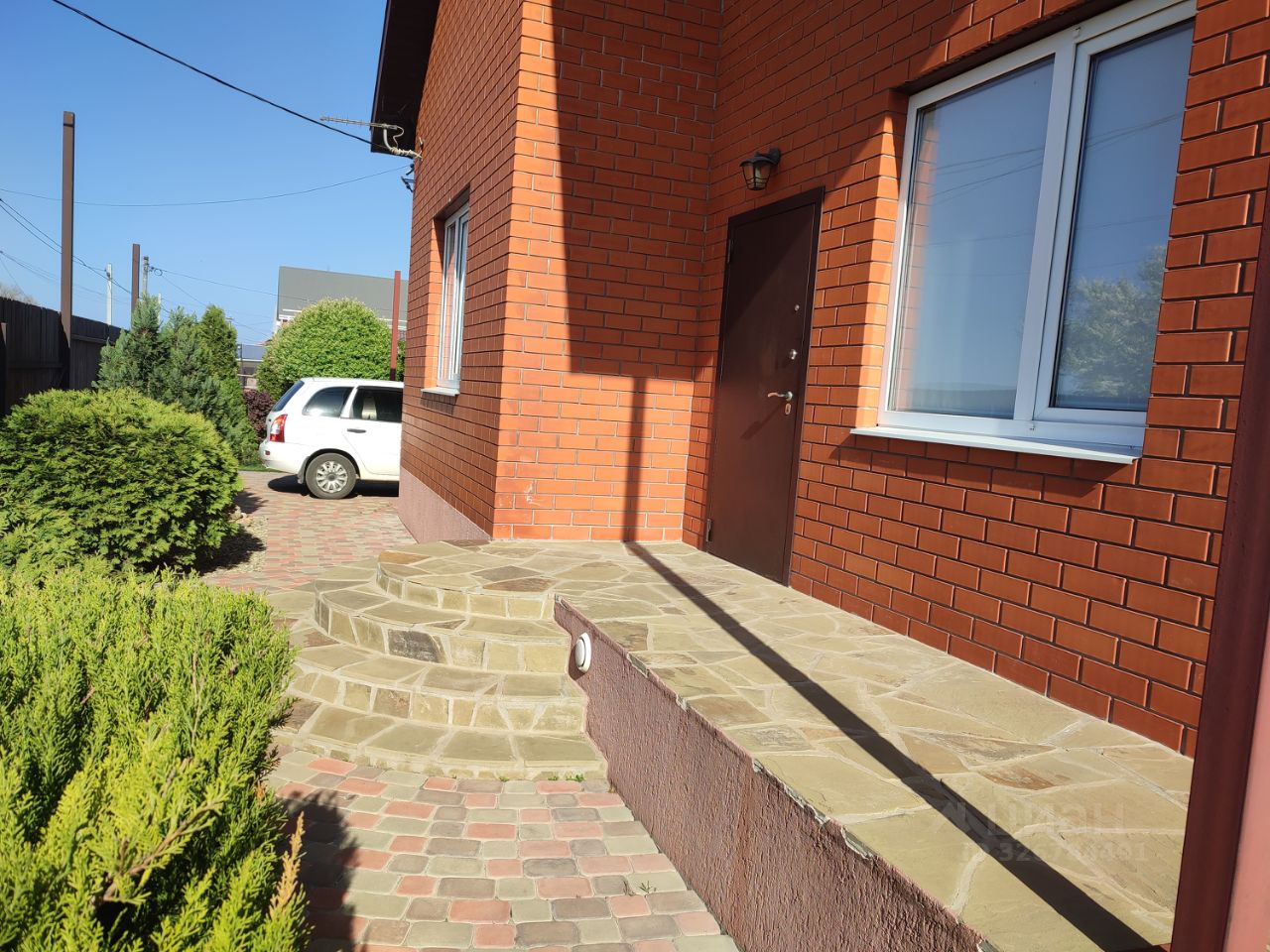К дому прилегает огромная деревянная терраса. Во дворе плитка, скважина, озеленение: декоративные растения, сосны, пихты и газон, есть фруктовые деревья и кустарники, небольшой огородик. Скважина. Всё оснащено системой автоматического полива. Имеется заезд на 2-3 машины. Автоматические ворота. Есть хозпостройка с сараем и баней (не оборудована), уличный туалет.