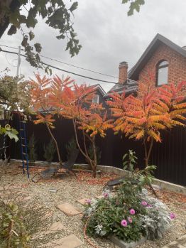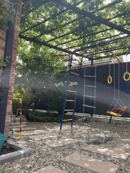 Во дворе в зеленых зонах высажены молодые деревья и кустарники: яблоня, груша, слива, инжир, смородина, сирень, розы и т.п.