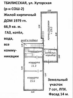 Станица Тбилисская, р-н СОШ-2. Жилой кирпичный дом по ул. Хуторской. 1979 г. п. Общая площадь дома 66,9 кв. м. Жилая 37. Два входа. Кухня/столовая (или гостиная) 29 кв. м, две комнаты (15,6+11,3); с/санузел, котельная/коридор. ГАЗ, котёл, вода, все коммуникации. Есть подвал, кирпичная хозяйственная постройка и плодовые деревья. Земельный участок 7 сот, ЛПХ. Ограждён по периметру. Фасад 14 м. Широкая и спокойная (безопасная) улица. В шаговой доступности любые магазины продуктовые, детские товары, мото-велотехника, мебельный, хозяйственные, фикспрайс, пункты выдачи товара сети WB и OZON; а так же почта, ШКОЛА, автобусные остановки. Цена: 2 млн. 500 тыс. руб. ТОРГ. P.S.: Станица Тбилисская - административный центр Тбилисского района Краснодарского края. Расположена в центральной части Краснодарского края, на правом берегу реки Кубань, в 100 км на северо-восток от Краснодара, и на высоте около 102—105 метров над уровнем моря. Протяжённость станицы с запада на восток около 10 километров. Население — около 25 317 жителей. В станице весьма развита инфраструктура. В ней есть дошкольные учреждения, общеобразовательные школы, а так же церковно-приходская школа и школа искусств; библиотеки, кинотеатр, клубы, различные секции и кружки, коллективы народной самодеятельности, стадионы. Работает филиал МФЦ. На территории станицы действуют несколько крупных сельскохозяйственных и перерабатывающих предприятий: Тбилисский маслосырзавод, Тбилисский сахарный завод, маслопрессовый завод, предприятие по производству комбинированных кормов, семенной завод, завод Центр Соя, элеватор. Развита сеть торговых супермаркетов. В Тбилисской находятся два православных прихода Тихорецкой епархии Кубанской митрополии Русской Православной Церкви. Это Свято-Покровский храм и Храм святого апостола Андрея Первозванного. По северной окраине станицы проходит автомобильная дорога регионального значения Р251 Темрюк — Краснодар — Кропоткин, которая соединяет федеральные автодороги М4 Дон, и М29 Кавказ. В центре станицы расположена автостанция через которую проходят транзитные междугородные автобусные маршруты, а также автобусные маршруты местного назначения. В станице расположена и железнодорожная станция Гречишкино на линии Краснодар — Кавказская, Северо-Кавказской железной дороги. В станице действует 5 автобусных маршрутов, также существует несколько служб такси. Расстояние до крупнейших и ближайших городов (по автодорогам) Кропоткин 33 км. Краснодар 108 км. Майкоп 134 км. Армавир 107 км. Ставрополь 198 км. Ростов-на-Дону 257 км. Москва 1 309 км. до Азовского моря (г.Ейск) 260 км. до Черного моря: Анапа 278 км. Джубга 205 км. Новороссийск 270 км. Симферополь 549 км. Сочи 354 км.