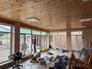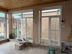 На территории летняя кухня, полностью застеклённая, панорамные стёкла