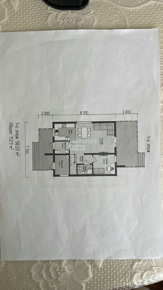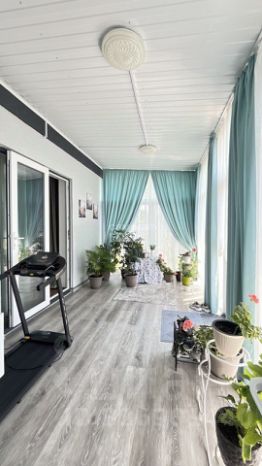 1 этаж: Просторная прихожая, комната (сейчас гардеробная с окном и выходом на террасу, легко переоборудовать в спальню), современный санузел, большая кухня-гостиная с выходом на остекленную террасу. На террасе расположена котельная с отопительным котлом и системой очистки воды.