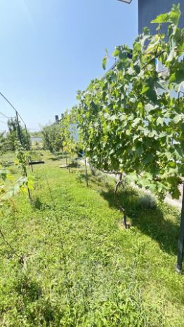 Плодоносящий сад: Ровный участок с плодоносящим садом (инжир, виноград, груша, яблоня, клубника), зеленый газон и прекрасный розарий.