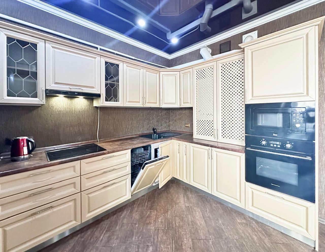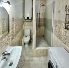 Кухня вся с техникой: посудомойка, духовой шкаф, холодильник, так же на первом этаже в душевой установлена стиральная машина.