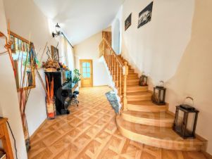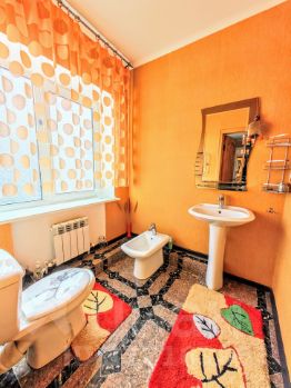 Первый этаж состоит из жилой комнаты, большой кухни-гостиной, с/у, котельной и коридоров. На стенах обои, потолок окрашен, пол застелен ламинатом. В комнате совмещенный с/у с душем, оклеен самоклеящимися панелями. В просторной кухне-гостиной стены и потолок окрашены, пол застелен ламинатом, в зоне кухни, рабочая стена обшита фальш-панелью, пол облицован плиткой. Большой совмещенный с/у окрашен колером, одна из стен декорирована под дикий камень, пол застелен керамогранитной плиткой. Во всем доме установлены металлопластиковые окна и двери. Счетчики на все коммуникации. Две сплит-системы. Интернет. Стационарный телефон. Спутниковое ТВ. Автоматический газовый водонагреватель. Отопление - напольный газовый котел с регулировкой температуры и возможностью отключать второй этаж. Входные двери - металлопластиковые.