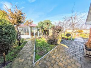 Из хоз.построек: гараж, баня с душевой и залом для отдыха, сухой подвал, помещение свободного функционала, большая беседка для отдыха и пикника, большой навес, вольер для собак, уличные удобства. Канализация - септик. Ухоженный земельный участок о.п. 13,69 соток (есть межевание), с плодовыми (много яблонь, сливы, груши, чернослив, шелковица черная и белая, персик, две черешни, смородина, несколько сортов винограда и т.д.) и декоративными деревьями и кустарниками. Благоустроенный двор, построен декоративный пруд с кувшинками, колодец с насосами для поддержания напора воды, для удобства сделаны тропинки из камня. Свободная территория двора вымощена тротуарной плиткой. Железный забор, ширина фасада 22,18 м.. Перед двором есть место для стоянки автомобиля.