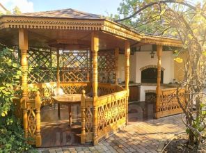 Второй гараж располагается отдельно стоящим зданием во дворе. Так же рядом с домом расположены зона барбекю и беседка, украшенные деревянными декоративными элементами.