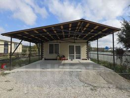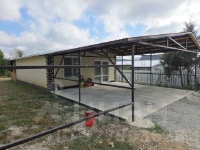 Благоустроенный двор, залита бетонная площадка под авто с навесом.