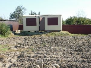 Двое въездных ворот. На участке: вагончик-бытовка.