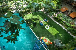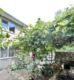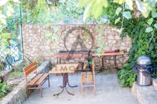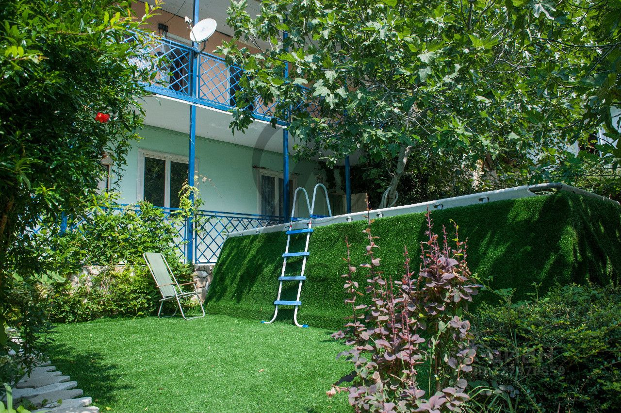 открытая столовая под навесом, бассейн , детская игровая зона, много зелени из плодовых и декоративных растений, все дорожки, террасы вымощены и забетонированы, есть парковочные места.