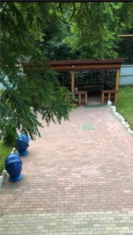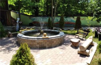 Очень уютный зеленый двор с отдельно стоящей верандой и зоной барбекю. Есть гараж, летняя кухня, во дворе располагается фонтан. Двор огорожен забором.