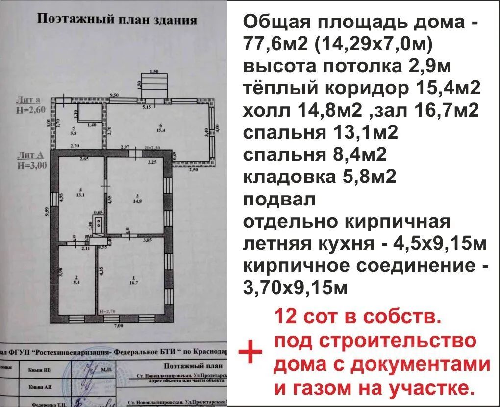 Летняя кухня (кирпичная): 4,5 х 9,15 м. Соединена с домом кирпичной пристройкой.