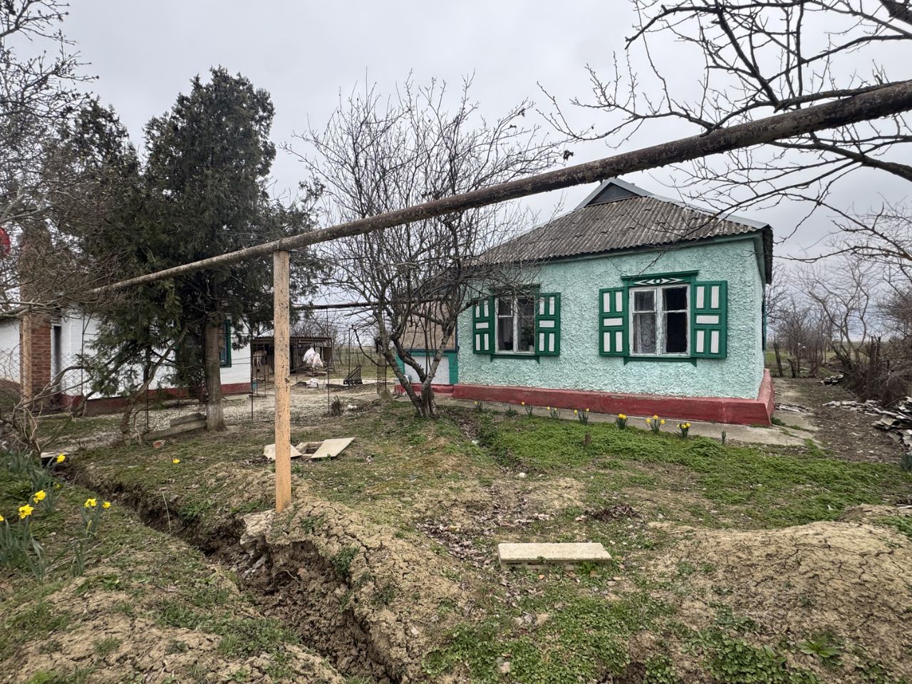 Площадь жилого дома- 60 кв. м, планировка: прихожая, 2 изолированных комнат и 2 проходных, кладовая с отдельным входом. + отдельно стоящая кухня с душевой, кладовой и хоз. блоком.