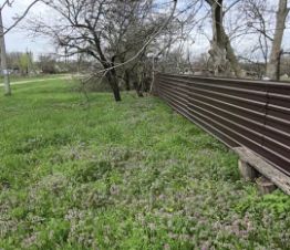 Забор участка двухкомпозитный и легко монтируемый - металлопрофиль и сетка-рабица (демонтаж не станет для вас нагрузкой). На территории растут фруктовые и ореховые деревья.