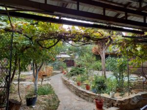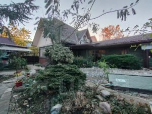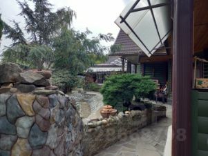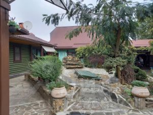Двор благоустроен дорожками, площадками из природного камня, декоративный пруд, множество декоративных насаждений.