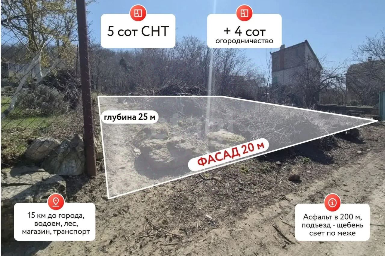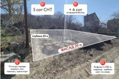 Участок площадью 5 соток с исключительно широким фасадом в 12 метров расположен в пригороде Анапы, в живописной предгорной зоне +4 сотки рядом для едения огородничества!!!