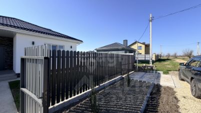 Участок полностью благоустроен: засыпан чернозёмом, по периметру высажены деревья. Ограждение — металлический забор высотой 1,8 м, фасадный забор и ворота из металлического штакетника. Организована парковка 46 м, выполнены отмостка и дорожка к дому.