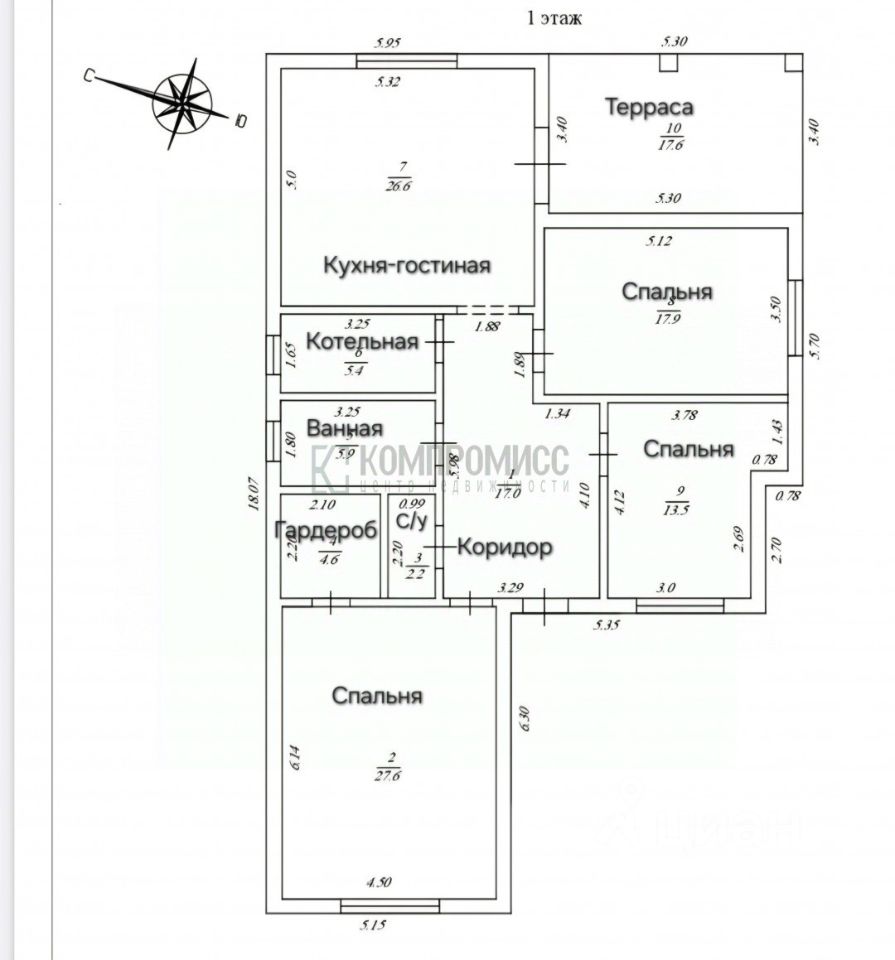 В доме 3 раздельных комнаты, одна из них с гардеробной, просторная кухня-гостиная с выходом на террасу, санузел раздельный, котельная и коридор.