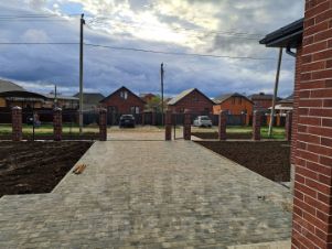 Участок 10 соток ИЖС, правильной прямоугольной формы, широкий фасад, огорожен по периметру, с фасада евроштакетник на кирпичных столбах, ворота откатные, калитка. Придомовая территория ухожена, парковка перед домом и отмостка вымощена тротуарной плиткой.