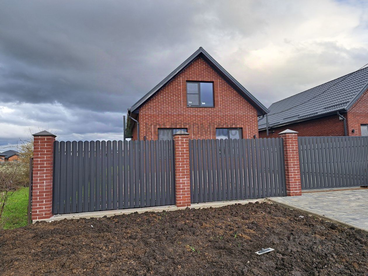 забор по периметру из профлиста, с фасада евроштакетник на кирпичных столбах;