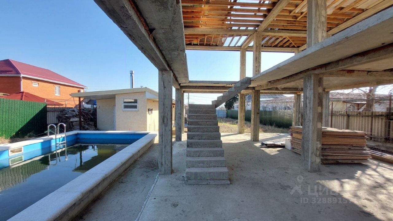 Во дворе имеется недостроенное здание размерами 14*8м. В здании два этажа плюс мансардный этаж, фундамент - свайная плита толщиной 50 см, залиты колонны и пол на втором этаже.