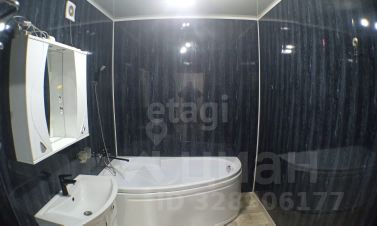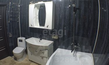 Санузел оборудован угловой акриловой ванной 160х120, стильным умывальником с тумбой, шкафом с зеркалом, и унитазом. Вся сантехника в отличном состоянии. Отделка качественной, современной плиткой и панелями, потолок натяжной со встроенными светильниками.