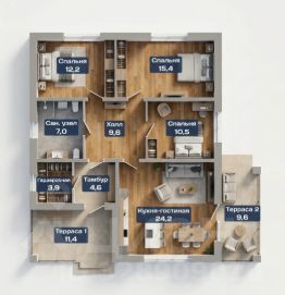 Как устроен: Входная терраса тамбур с большой гардеробной (верхняя одежда, обувь, коляска — всё скрыто от глаз); Просторная прихожая; Три изолированные спальни; Светлая кухня-гостиная с выходом на вторую террасу — летнюю, для завтраков на свежем воздухе; Большой санузел. Две террасы — это редкость. Одна встречает гостей, вторая — ваше личное место для отдыха с видом на участок.