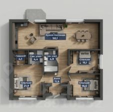 Планировка: Мастер-спальня с собственным санузлом и гардеробной; Ещё две изолированные спальни; Кухня-гостиная 50 м² с выходом во двор; Тамбур с двумя нишами для хранения; Общий санузел и прихожая.
