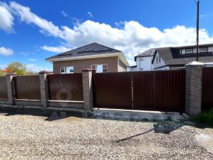 Участок огорожен по периметру забором, с фасадной стороны — кирпичные колонны, откатные ворота, калитка.