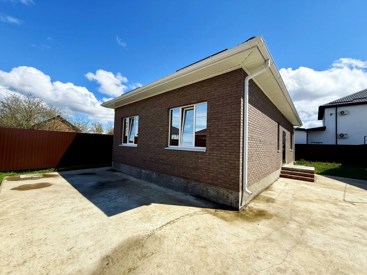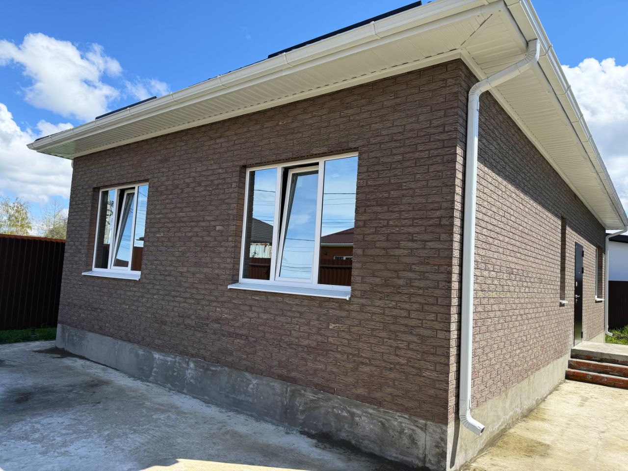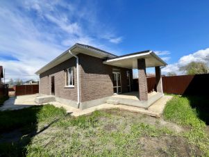 Дом общей площадью 80 современной планировки, визуально поделен на приватную и гостевую зоны, где крыльцо, просторный холл, три спальни, совмещенный санузел 5 кв.м, кухня-гостиная 20 кв.м с выходом на крытую террасу и задний двор, с террасы вход в котельную 5 кВт . Коммуникации: вода — централизованное водоснабжение, свет — электричество, канализация — септик 9 куб.м, ведется газификация района. Дом — в предчистовой отделке.