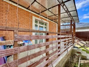 - участок не подтапливается, огорожен забором, двор перед домом забетонирован для парковки авто, большой навес,