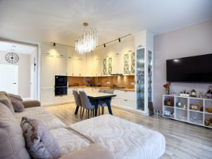 Общая площадь дома — 164 кв. м, плюс 15 кв. м подвала под террасой. Качественный ремонт в светлых тонах выполнен два года назад, всё в отличном состоянии. Дом полностью готов к проживанию и обставлен мебелью с бытовой техникой.