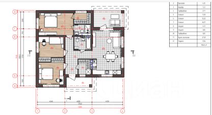 в доме три комнаты 13,10+12,22+16.57 м2, столовая-гостиная 27,81 м2 с выходом на террасу 11,06 м2, две гардеробные, два санузла.