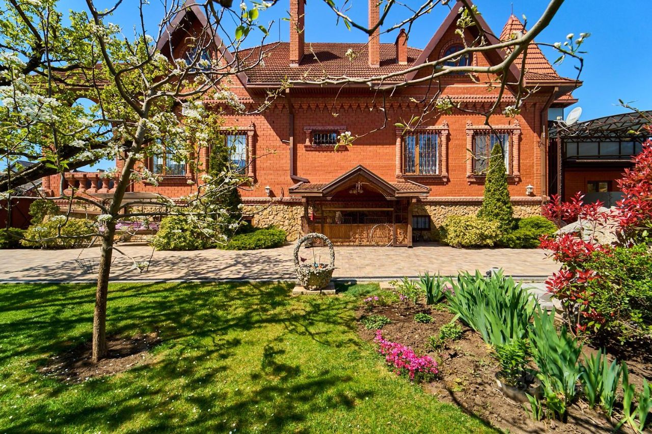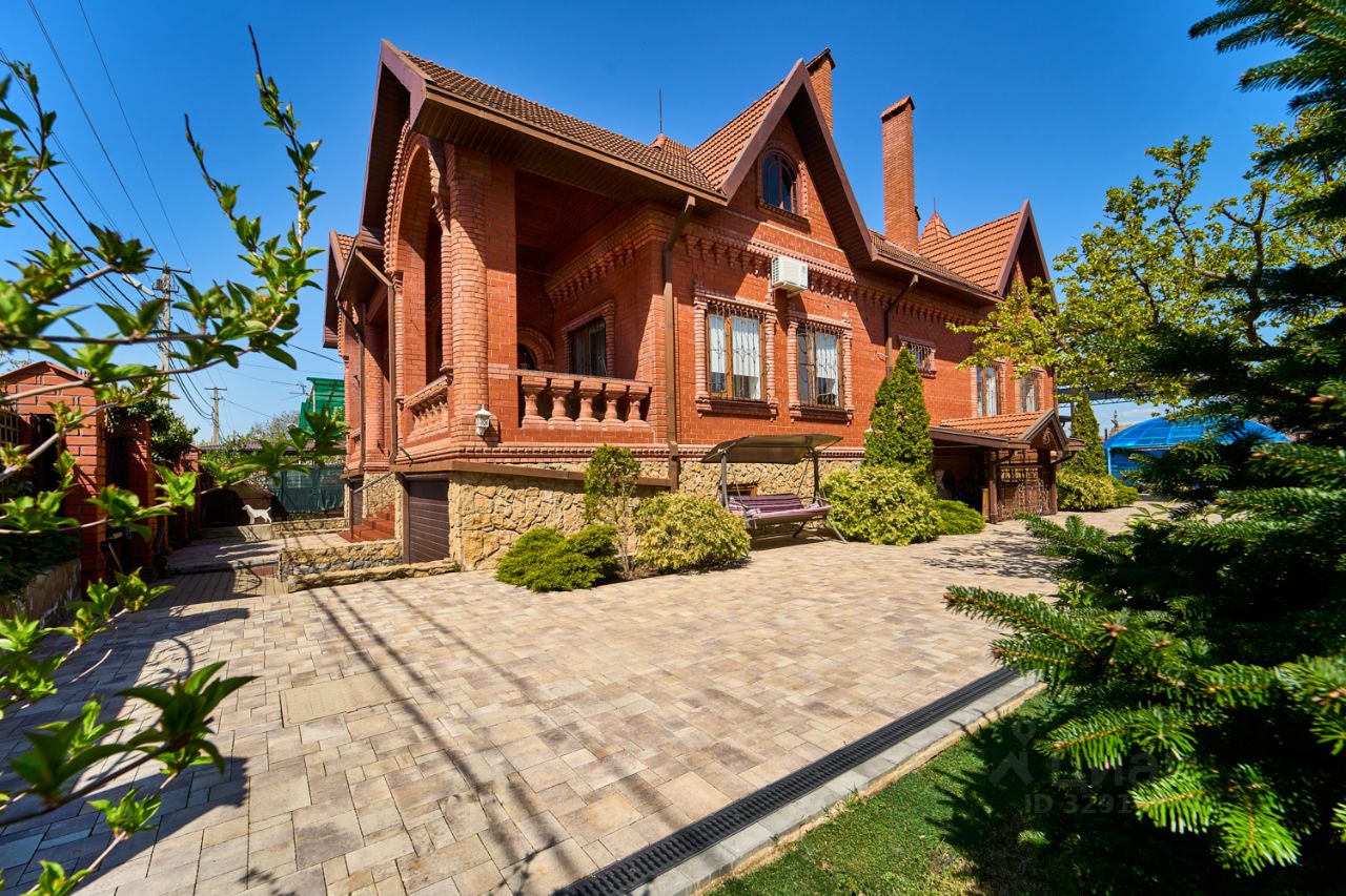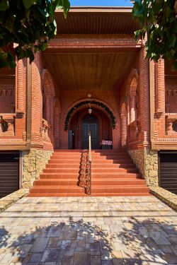 Дом полностью кирпичный, с черепичной крышей , с полноценным цокольным этажом и гостевым домиком. Фасады декорированы элементами из точеного красного кирпича, большие оконные проемы, забор по фасаду с кирпичными колоннами и металлический забором с кованными элементами.