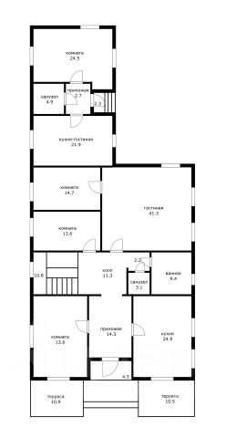 На первом этаже: три спальни, одна из них с кабинетом, огромный зал 41 кв.м., кухня-гостиная 25 кв.м., два сан. узла, просторные холлы, гардероб.