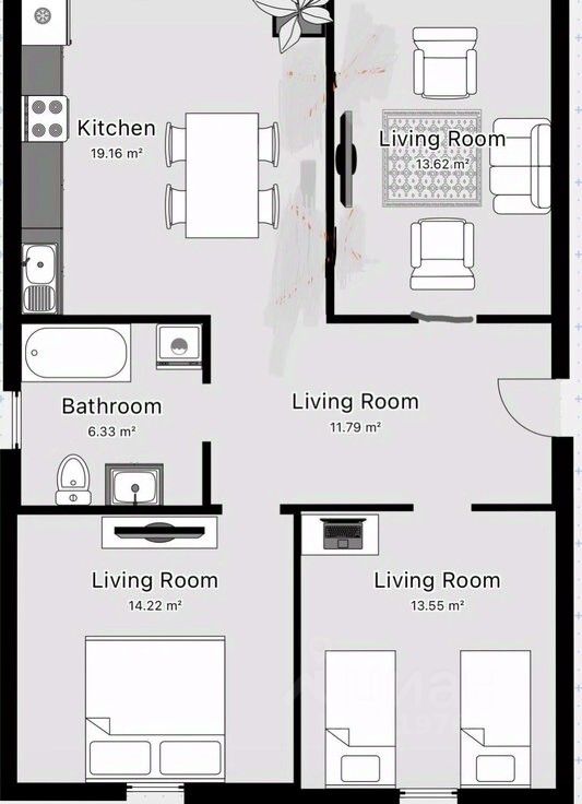 В доме выполнен минимальный ремонт: свежая покраска стен и новый ламинат в двух комнатах, а также стильная плитка в коридоре и кухне-гостиной. Дополнительно закуплен аналогичный ламинат для третьей комнаты и плитка для санитарного узла - вам останется всего лишь завершить работу по своему вкусу!
