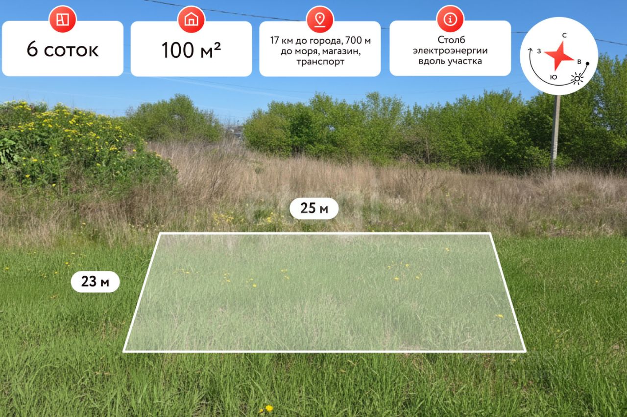Продается земельный участок на побережье Азовского моря в станице Голубицкая. Площадь участка составляет 6 соток. Участок ровный, с удобными размерами. Фасад 26 метров, периметр 98 метров.