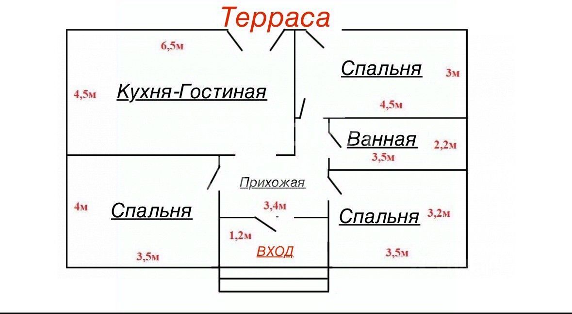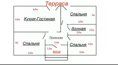 Терраса 2*7=14м.кв. на которую есть два выхода,с кухни и с одной из спален.