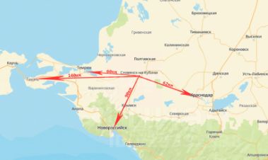 до Черноморского побережья (г. Анапа, г. Новороссийск, Геленджик) —90/130 км.