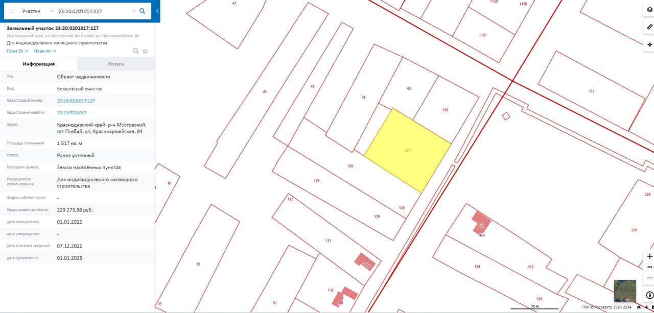 Краснодарский край, Мостовской р-н, пос. Псебай, ул. Красноармейская, 84. Кадастровый номер 23:20:0201017:127 Площадь 1517 кв.м.