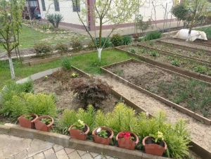 Участок 5,67 соток: небольшая действующая баня-бочка, подсобное помещение, две теплицы. Перед домом — навес для двух машин. Высажен плодоносящий сад и огород, двор выложен плиткой.