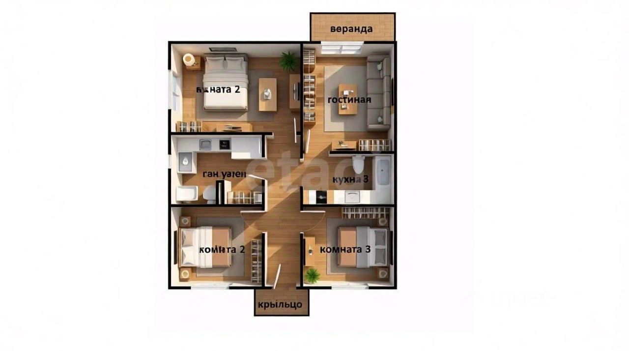 планировка: 3 спальные комнаты, просторная кухнягостиная с выходом на веранду, совмещённый санузел, коридор;
