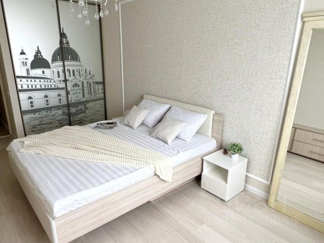 Квартира оборудована новой современной мебелью, кровать King Size 200*200 с ортопед.матрасом. Диван раскладной с полноценным большим 2-спальным местом. Вместительная гардеробная комната, гладильная доска, утюг, фен, сушилка для одежды, хлопковое постельное бельё, полотенца !+ ВСЯ бытовая техника, в т.ч. посуда. Квартира очень теплая зимой, мощная СПЛИТ-система (тепло+холод), ЖК ТВ (120 каналов) + скоростной ИНТЕРНЕТ Wi-Fi.