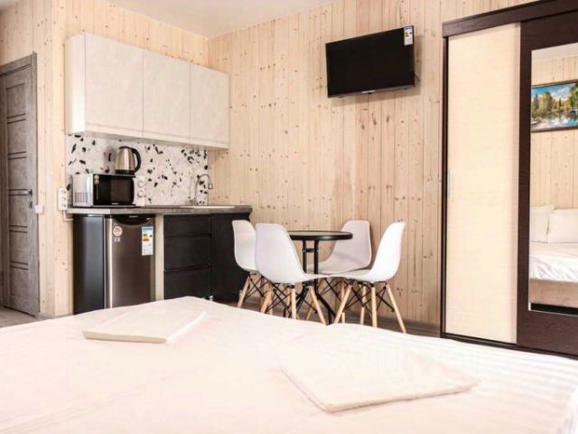 - Шкаф, кухня с набором посуды, холодильником, эл. плитой, чайником, микроволновой печью, ТВ, кондиционер, бесплатный Wi-Fi, возможна доп. кровать или детская кроватка.