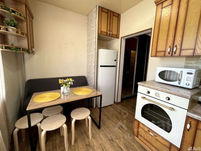 В квартире (56 м2) большая кухня (14 м2) и две комнаты (15 м2), совмещенный санузел, застекленный балкон.